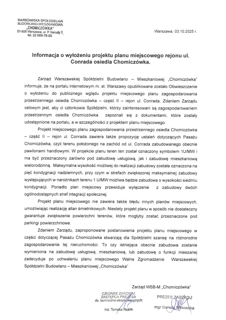 MPZP Chomiczówka II – informacja Zarządu 10_2025
