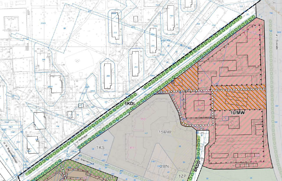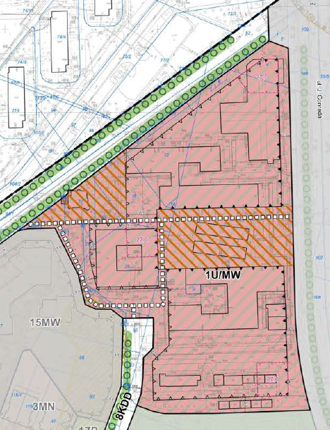 - Przeznaczenie terenu pod zabudowę usługową i mieszkaniową wielorodzinną z lokalami usługowymi w parterach, przy czym