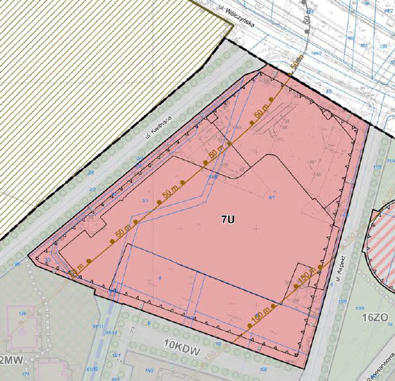- wydzielenie z obszaru 7U części działek 6, 8, 9, 10, 108, 112 (niebieski obrys w dolnej części)