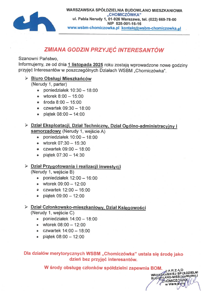 W środy obsługę członkom spółdzielni zapewnia Biuro Obsługi Mieszkańców (Nerudy 1, parter).